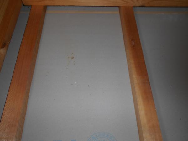 屋根および屋根裏の詳細な確認を行ったところ、雨漏りによる浸水痕跡は確認されませんでした。しかし、屋根裏には多量の糞が確認され、天井に染みが発生していた箇所の直上にある断熱材にも、糞尿による汚れと染みが見受けられました。